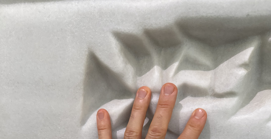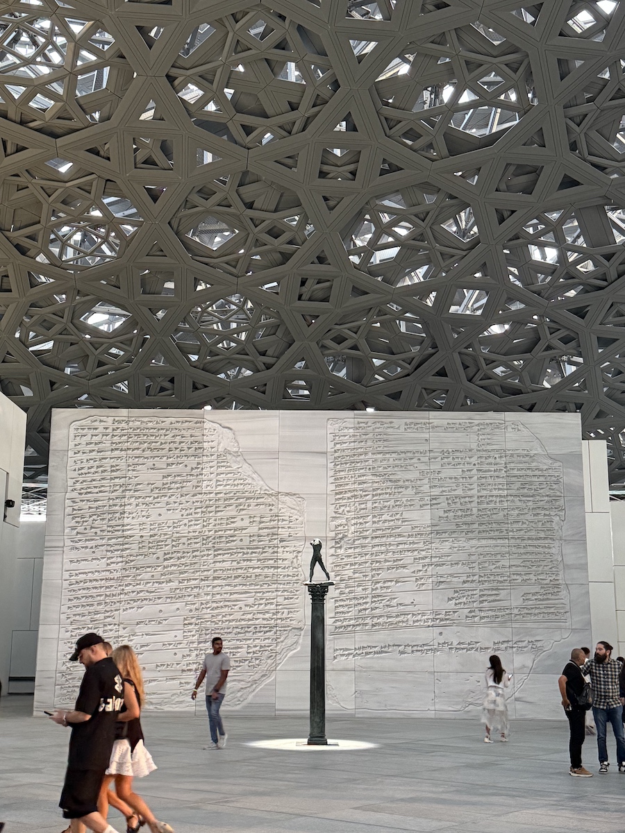 - Jenny Holzer is mostly known for her witty poetic phrasing on oversized posters, a jumbo “text artist” of sorts. I actually don’t mind her work generally, it’s definitely above average compared to the admittedly modest standards of the “art fair” scene. That being said, perhaps her typical fare is a bit too political for the Sheikh Zayed crowd? In any event, this 2017 work of hers at the Louvre Abu Dhabi shows remarkable artistic flexibility and sensitivity. I really think she got the butter and the money for the butter in creating a contemporary artwork that thoughtfully reaches into the past while also holding its own against the dramatic, impossibly-domed Jean Nouvel superstructure.