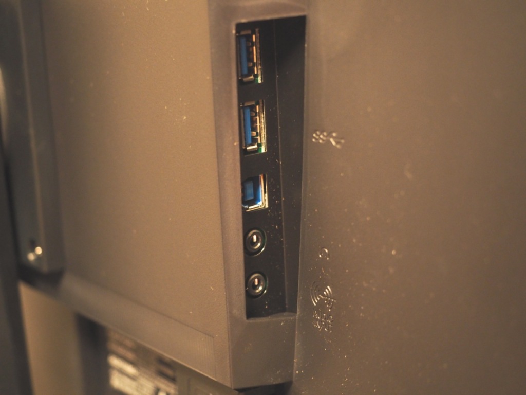 When facing the back of the screen, the right-side ports are, from top-to-bottom : USB 3.0, USB 3.0, USB 3.0 “Upstream,” Headphones, and Audio Input.